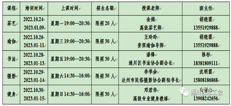 经前期征集意见,职工自愿报名,区总工会办公室审核,通川区职工活动中心2022年第一期公益业余培训班招生工作已圆满结束,现将开学有关事宜通知如下: