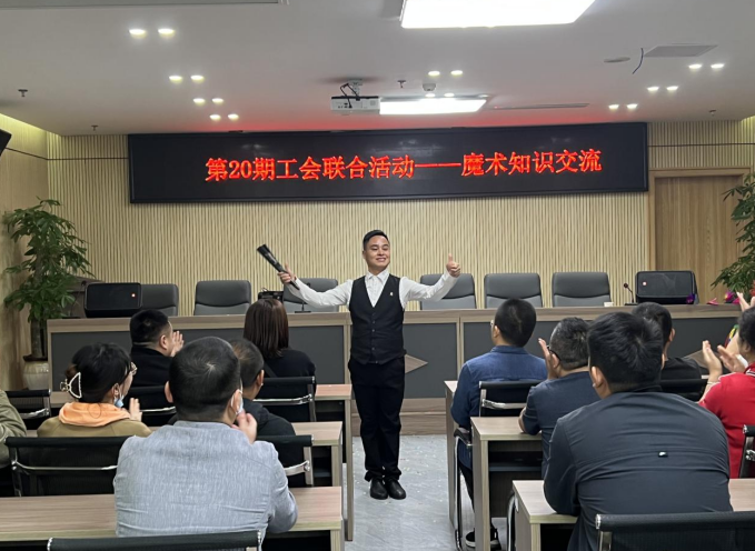 魔术知识讲座上,老师用生动、夸张有趣的专业动作,吸引着在座职工的目光,并用熟练的手部技巧展示了各式各样的魔术表演。魔术老师还不时与台下的职工们互动,让大家配合表演,把活动气氛带到了最高潮,呼声和掌声连绵不绝。
