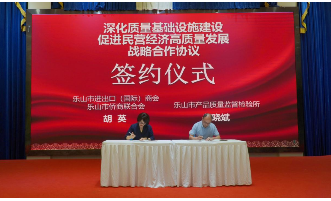 为贯彻落实党中央国务院《关于促进民营经济发展壮大的意见》《质量强国建设纲要》,座谈会上,乐山市产品质量监督检验所所长赵晓斌与乐山市进出口商会、乐山国际商会、乐山市侨商联合会会长胡英签订《战略合作协议》。双方就质量管理、品牌建设、标准制修订、知识产权维权保护、产品质量鉴定、检验检测、代办服务等方面达成战略合作意向。