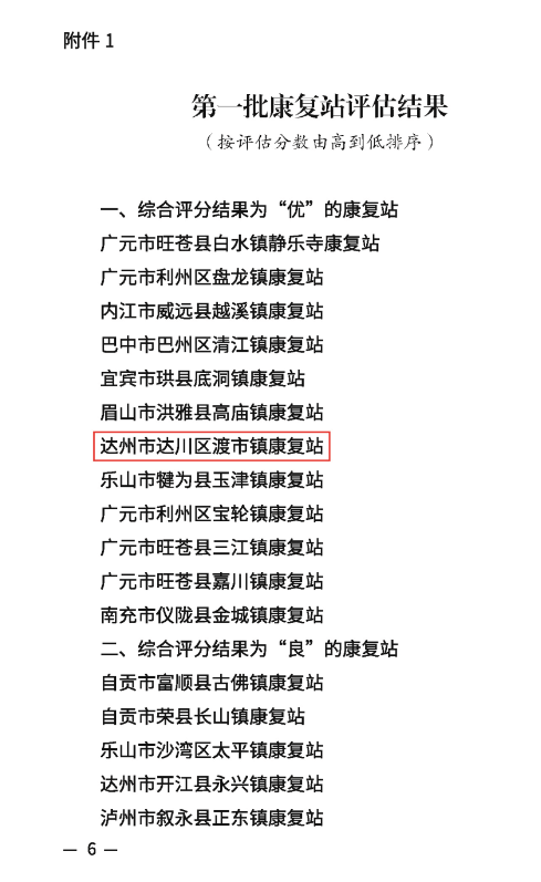 喜报!达川区渡市镇尘肺病康复站在全省尘肺病康复站服务质量评估中连续两年综合评估结果均获“优”的佳绩