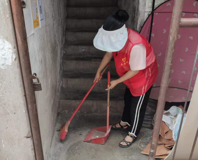 (图为:志愿者在南坝社区居民楼打扫楼院)