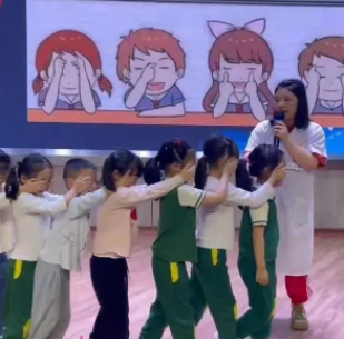 在讲解中,医务人员结合日常生活,通过生动的游戏和形象的画面向孩子们介绍了护眼的基本知识和方法,还指导孩子们正确“一尺、一拳、一寸”的坐姿、阅读距离等知识,并提醒他们在使用电子产品时要注意保护眼睛。还现场带领孩子们进行了正确的眼保健操演练。此外,医务人员通过PPT为大家讲解了气道梗阻、烫伤、鼻出血、扭伤及出血专业知识,详细讲解了异物呛入气管发生窒息时的急救处理措施,现场示范了海姆立克急救法,手把手指导家长们急救时的站位和手法等。互动环节中孩子们积极参与,纷纷举手发言,表现出很高的学习热情和好奇心,整个现场学习氛围十分浓厚。