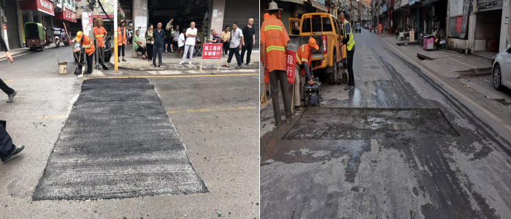 在6月份的一次巡查中,公路中心发现部分路段路面有不同程度的破损,影响车辆通行,存在有一定的安全隐患。中心迅速组织人员和设备进行修复,仅用两天时间就完成了修复工作,确保了道路畅通。