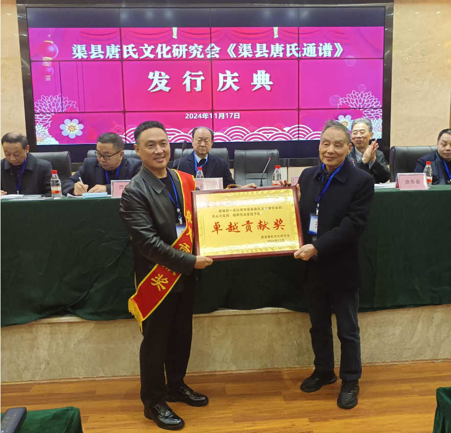 会上,渠县唐氏通谱编委会执行主编唐中华就《渠县唐氏通谱》编修过程、内容作讲解说明。接着举行《渠县唐氏通谱》颁发仪式。