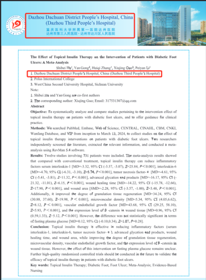 由达州市第三人民医院护理部胡诗贝领衔的Meta分析研究《The effect of topical insulin therapy on the intervention of patients with diabetic foot ulcers: a Meta-analysis》成功入选本次大会壁报展示环节。