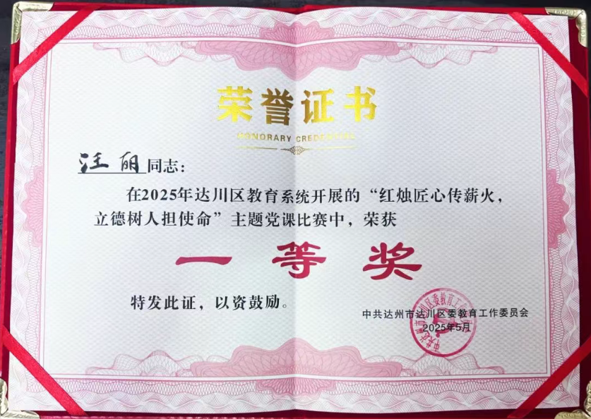 5月16日,四川省达县职业高级中学党员教师汪丽,在2025年全区教育系统“红烛匠心传薪火 立德树人担使命”主题党课决赛中,荣获一等奖。 汪丽老师作为学校党员教师的优秀代表,在此次党课比赛中,她以生动的案例、深刻的见解,将党的精神内涵与教育使命娓娓道来,展现出扎实的理论功底和出色的授课能力,赢得了评委和观众的高度认可,最终脱颖而出获得一等奖。此次荣誉不仅是汪丽老师个人的光荣,也是达县职高党建工作与党员教师培养成果的有力见证。 达县职业高级中学十分注重发挥党员的先锋模范作用。学校定期组织教育教学研讨会,鼓励党员走上讲台讲党课、赛党课,分享教学经验与心得,在交流中碰撞思想火花,探索教育教学新方法,将党的教育方针更好地贯彻到教学实践中。
