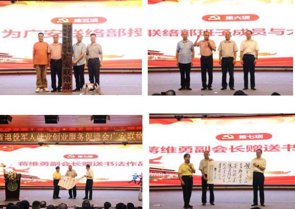 授牌仪式将大会推向了高潮。省军促会副会长侯仕鑫、副会长孙克勇为广安联络部授牌,尹才忠、尹长春上台庄重接牌。这一时刻意义重大,象征着广安联络部正式肩负起服务退役军人就业创业的重任,将在促进退役军人融入社会、实现自身价值等方面发挥重要作用。随后,广安联络部班子成员集体亮相,他们精神抖擞,庄严宣誓,展现了积极向上的工作风貌和为退役军人服务的坚定决心。省军促会副会长蒋维勇为联络部赠送书法作品,李隆席、吴开明副部长上台接过并合影留念。书法作品寓意深刻,饱含着对联络部工作的美好祝愿和殷切期望。