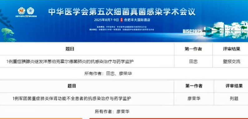 近日,由中华医学会、中华医学会细菌感染与耐药防治分会主办的中华医学会第五次细菌真菌感染学术会议在合肥市圆满召开。作为国内感染性疾病领域高起点的多学科交流平台,本次会议汇聚了来自感染、重症、呼吸、血液、临床微生物、临床药理/药学、院感防控等多学科专家,聚焦提升我国细菌与真菌感染诊治水平及抗菌药物合理应用能力。 会坛传佳绩 SAN YUAN 经前期论文投稿及大会严格遴选,我院临床药学团队取得突破性成果:临床药师田忠的案例入选壁报交流,廖荣华药师的案例入选大会论文集。其中,田忠汇报的壁报题目为《1例重症胰腺炎继发洋葱伯克霍尔德菌肺炎的抗感染治疗与药学监护》。该病例由临床药学室牵头,联合多学科团队多次会诊、讨论,最终成功治愈。值得关注的是,广谱抗菌药物的使用可能会筛选出少见条件致病菌,例如此病例中的洋葱伯克霍尔德菌,该菌对临床常用抗菌药物天然耐药,易导致治疗失败,具有较高的学术研究与临床警示价值。 双轮驱发展 SAN YUAN 近年来,我院临床药学工作通过持续积累与发展,已逐步形成“临床实践-科研创新”双轮驱动的良好局面。随着医院多学科联合诊疗模式(MDT)的深化推进,临床药师已全面参与复杂病例的会诊与诊疗决策,为患者提供精准、个性化的药学服务,在促进临床合理用药、解决实际诊疗问题等方面发挥关键作用。在科研领域,团队成果丰硕:发表学术论文10余篇,其中5篇被国内重要学术会议收录;主持省级科研项目1项、市级科研项目1项,科研能力稳步提升。 未来,达州市第三人民医院临床药学团队将继续以患者需求为导向,强化临床实践能力,深化科研创新,为推动医院高质量发展、保障患者用药安全与健康贡献更大力量。