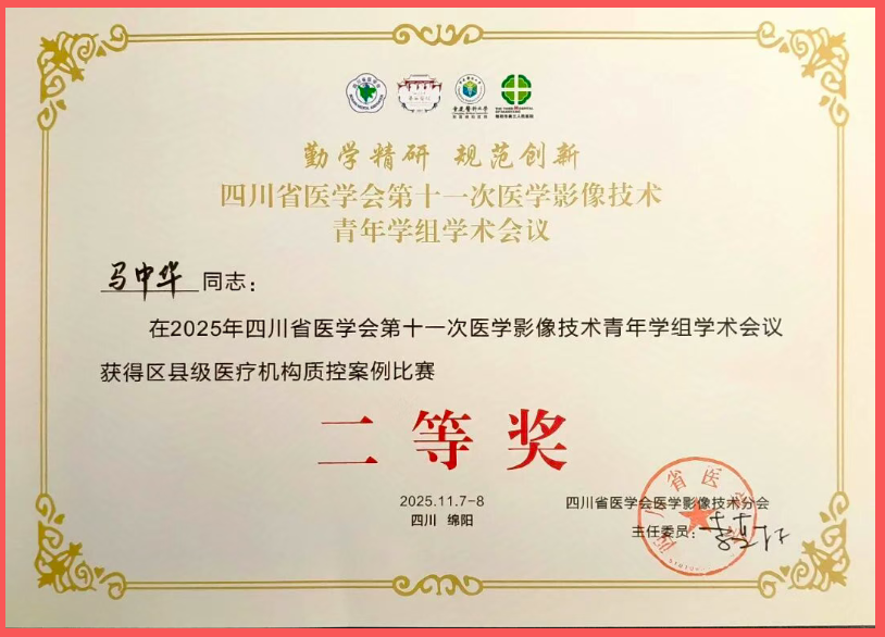 11 月 8 日,四川省医学会第十一次影像技术青年委员会学术会议在绵阳举办。达州市第三人民医院医学影像科马中华参赛的案例《拨开“魔角”的迷雾——基于多序列比对的肩关节磁共振诊断陷阱识别与质控体系建设》,凭借扎实的工作积淀与出色的现场汇报,最终斩获二等奖。 本次会议是四川省影像技术领域的高水平青年学术交流平台,汇聚了全省各级医疗机构的影像技术骨干。比赛现场,马中华对案例核心内容的深刻解读与全面呈现,获得了评委专家的一致认可与高度赞誉。 此次获奖,既是对医院医学影像科在质量控制领域不懈努力与突出成效的肯定,也是对医院长期坚持高标准、严要求,持续提升医疗技术服务水平的有力印证。达州市第三人民医院医学影像科将以此为契机,进一步优化完善质控体系,持续提升专业技术能力,全力为临床诊疗与患者提供更精准、可靠的影像学支持,为医院高质量发展添砖加瓦!