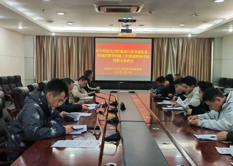 为纵深推进旅游市场秩序整治,严厉整治导游执业不规范、强制消费、不合理低价游等突出问题,切实维护游客合法权益,促进全区文旅行业健康有序发展,3月19日,达川区文体旅局纠治旅游行业导游乱象、强制消费等问题工作推进暨典型案例警示教育会。局分管领导出席会议,机关纪委、市场股、执法大队全体人员及各旅行社、营业网点、景区负责人参加会议。 会议坚持“学精神、明方案、敲警钟、压责任”一体推进。会前集中学习《旅游投诉处理办法》,进一步树牢法治思维,提升行业依法经营、部门依法监管、游客依法维权能力水平。会议传达贯彻上级有关集中整治会议精神,详细解读《达川区纠治旅游行业导游乱象、强制消费等问题工作方案》,明确目标任务、整治重点、实施步骤和责任分工,推动整治工作清单化管理、项目化推进。会议通报2026年第一批旅游市场强制消费典型案例,坚持以案为鉴、以案明纪、以案促改,引导各经营主体知敬畏、守底线、诚信经营、规范服务。 会议对下一阶段全区旅游市场整治工作进行全面安排部署。一是提高政治站位,压实主体责任。各经营单位要深刻认识规范旅游市场秩序的重要性和紧迫性,全面开展自查自纠,强化内部管理和行业自律。二是坚持从严监管,保持高压态势。 监管执法部门要加大巡查检查、线索核查和案件查办力度,对顶风违纪违法行为坚决从严查处、公开曝光,形成有力震慑。三是强化源头治理,健全长效机制。 坚持标本兼治、纠建并举,推动问题整改常态长效。 会议强调,旅游市场秩序直接关系民生福祉、关系行业形象、关系达川文旅品牌口碑。全区文旅系统和各市场主体要以此次会议为契机,牢固树立以游客为中心的发展思想,坚持问题导向、目标导向、结果导向,狠抓整改落实,强化服务提升,共同营造安全、有序、诚信、舒心的旅游消费环境,不断提升游客满意度和获得感,为达川文旅高质量发展提供坚强保障。 下一步,区文体旅局将持续加大整治力度,畅通投诉举报渠道,强化日常监管执法,常态化开展警示教育和普法宣传,坚决遏制各类旅游市场乱象,切实守护好游客“放心游、舒心游、明白游”的合法权益。