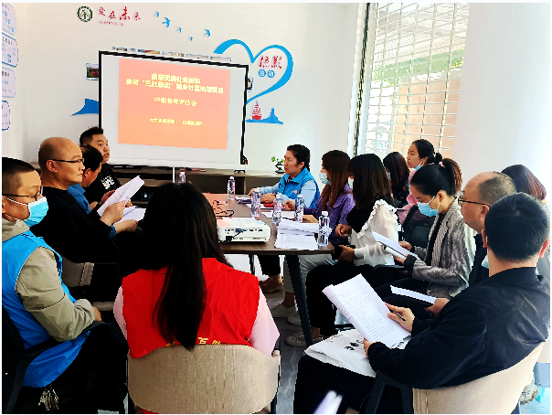 本次评估以听取汇报、资料查阅、现场访谈以及座谈会相结合的形式进行,各承接项目负责人依次就目前项目运行的概况进行了汇报,汇报人分别就项目的组织保障、项目进度、项目活动开展的情况、产生的社会影响、资金使用情况、项目的阶段性成果和成效、工作中的不足及下一步的打算和建议等进行了详细汇报。评估组以专业视角发挥“以评促进”的作用,逐一对各承接项目机构进行了总结和点评,肯定了开展过程中取得的成效,同时也指出了项目开展过程中存在的问题和不足,并给出了专业的意见和建议。评估组强调,各项目承接单位要在今后的工作中,要进一步发挥五社联动作用,提升项目的执行质量,总结好可复制、可推广的好经验。