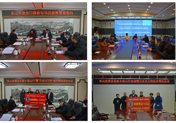 在“万企兴万村”项目投资签约仪式上,乐山市进出口商会分别与金口河区、马边县教育局签订了结对助学捐赠协议,乐山王府井购物中心有限责任公司分别与金口河区、马边县农业农村局签订了农产品销售合作意向书,君和环保股份有限公司与马边县高卓云村村委会签订了村企结对协议。乐山市进出口商会、乐山国际商会还向金口河区教育局捐赠5万元助学金、马边县教育局捐赠16万元助学金。金口河、马边县委政府领导对市工商联一行开展结对帮扶活动表示感谢,并表示会充分开发当地优质资源,通过平台共用、项目共建、利益共享产业发展配合机制,扎实推进村企合作不断深入,提升群众的获得感和幸福感。(作者:乐山市商会)