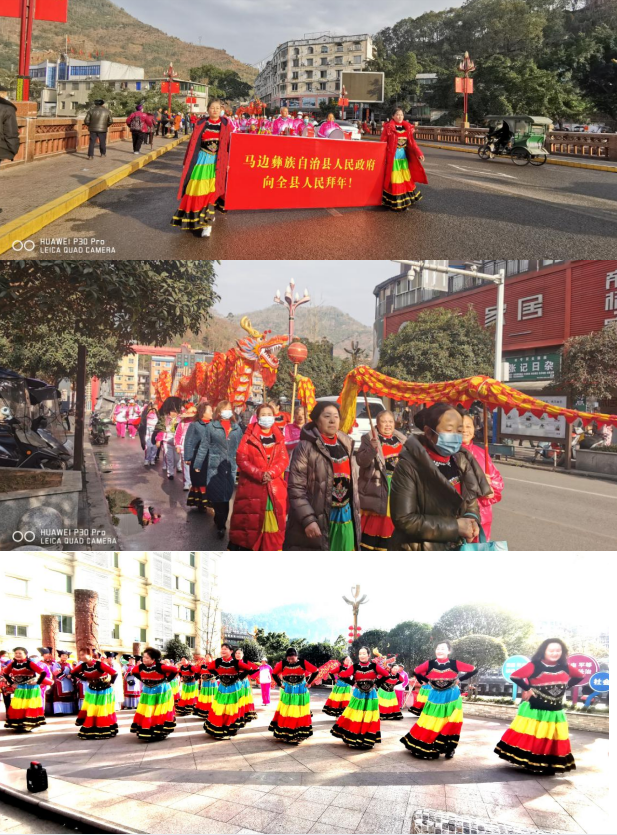 1月18日-19日上午,自治县老体协文化艺术分会腰鼓队、洋鼓队、龙灯队、舞蹈队队员们,与彝族舞蹈协会、模特协会的会员们一道,穿着节日的盛装,抬着“马边彝族自治县人民政府向全县人民拜年!”的红牌,沿马边县城主街道,敲锣打鼓,舞龙耍狮,定点表演彝族舞蹈《阿诗且》和龙灯,开展风采巡游展示拜年活动,祝全县人民新春快乐,兔年大吉,孜莫格尼!精彩的表演,赢得了驻足观看的市民阵阵热烈的掌声。