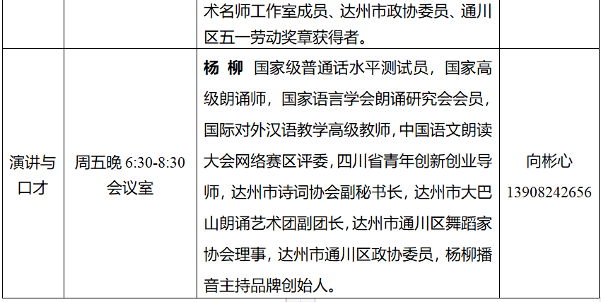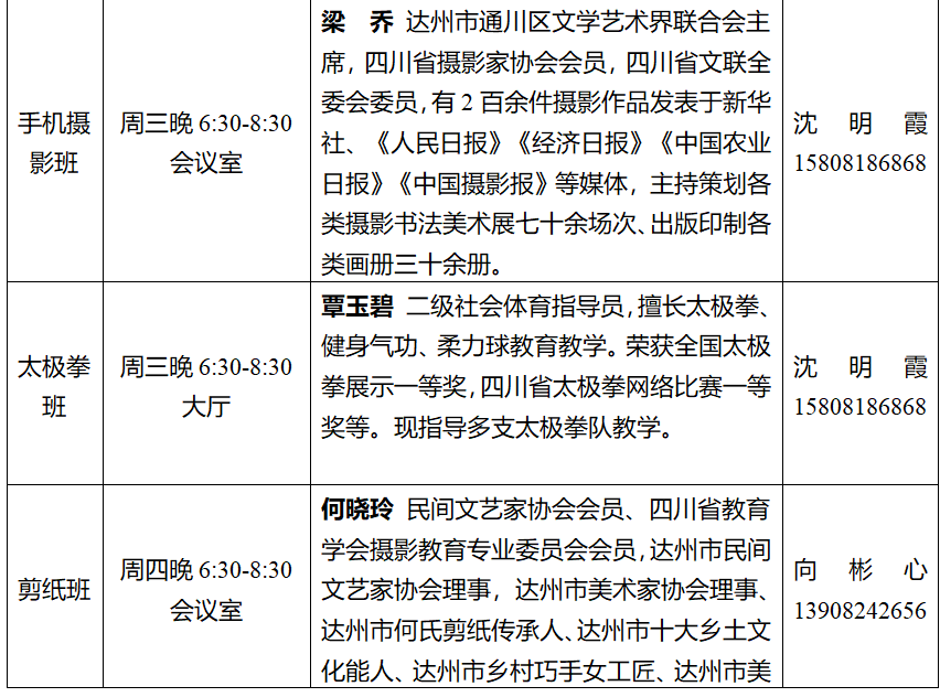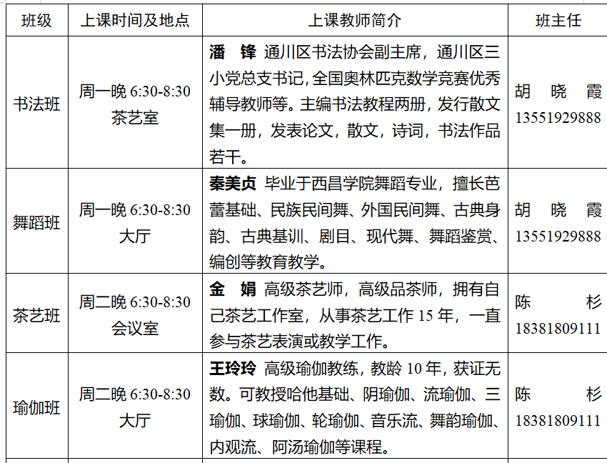 书法班30人、茶艺班25人、瑜伽班30人、舞蹈班30人、手机摄影班30人、剪纸班30人、太极拳班25,演讲与口才30人。