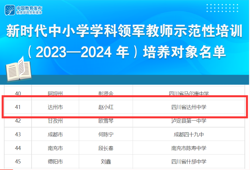 达州中学赵小红老师入选国家级教师培训项目培养对象名单