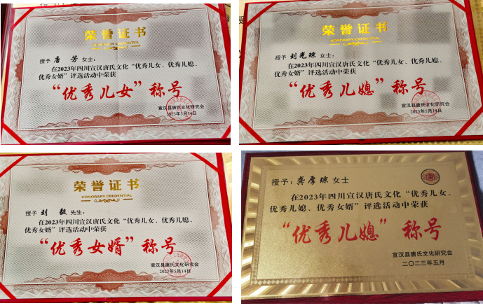 (唐晓琴家庭) 为了弘扬敬老、爱老、孝老的传统美德,积极响应四川省分会在全省唐氏宗亲中开展“优秀儿女、优秀儿媳”评选活动,在全县唐氏宗亲中树立一批敬老孝老爱老先进典型,促进家庭家教家风建设。为了表彰先进、弘扬敬老孝老爱老之风,在全社会营造尊老敬老助老的浓厚社会氛围,经本人申请、各支系推荐,县分会办公会研究决定:给予唐自梅等6名同志为“优秀儿女”、刘光琼等7名同志为“优秀儿媳”、刘毅等2名同志为“优秀女婿”的荣誉称号(名单另附)。希望受到表彰的“优秀儿女”“优秀儿媳”“优秀女婿”15名同志要珍惜荣誉,再接再励,充分发挥好先进典型的示范作用,发扬成绩,锐意进取,再立新功。