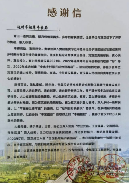 (宣汉县入围“全国县域经济百强县”,宣汉县委县政府向达州烟草发来感谢信)