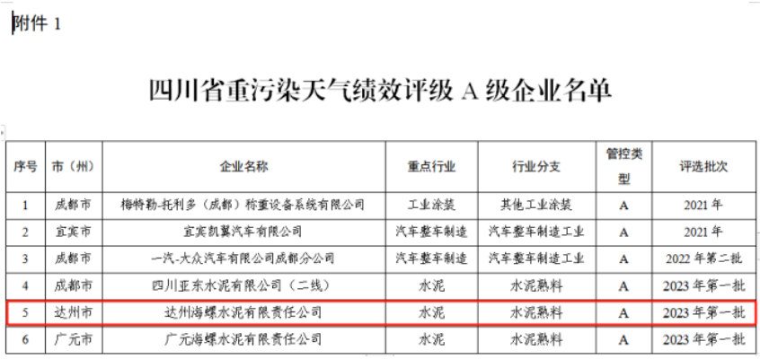 近日,四川省生态环境厅公布了2023年四川省第一批重污染天气重点行业企业绩效评级结果。全省共6家,其中位于大竹县的达州海螺水泥有限责任公司成功创建为重污染天气绩效评级A级企业,成为达州全市第一家A级企业。