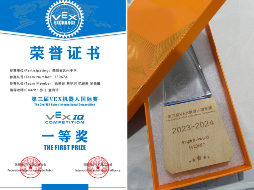 2023年11月10-12日,由国际青少年机器人联合会(FIYRA)主办的第三届VEX国际赛在重庆理工大学两江校区隆重举行,共有来自甘肃、四川、重庆、陕西、长沙、广州、越南等地的100多支机器人赛队,400多人参与了此次大赛。达州中学代表队(队号:73967A)表现出色,总斩获VEX IQ赛项一等奖和最佳促进奖(Inspire Award)两项大奖! (一等奖奖状和最佳促进奖奖杯)