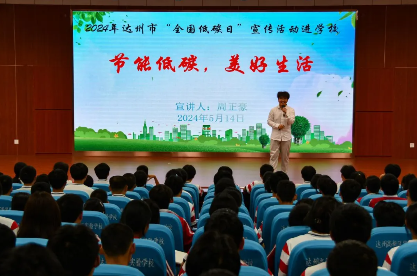 为推动形成绿色低碳的生产方式和生活方式,广泛开展节能降碳宣传教育,提高学生们的环保意识,倡导低碳生活方式,5月14日,由达州市生态环境局主办,四川文理学院、达州市生态环境科学研究院、达州市高新区生态环境局、达州高新区实验学校承办的以“绿色低碳 美丽中国”为主题的“全国低碳日”教育活动走进了达州高新区实验学校。 活动中,四川文理学院2023级化学与化工学院周正豪从低碳设立的背景、什么是低碳生活、为什么要践行低碳生活、该怎样践行低碳生活四个方面深入讲解了低碳相关生活知识,倡导同学们积极践行绿色低碳生活方式,并进行了低碳知识问答。活动现场,同学们也是踊跃提问,在积极的互动中增加了对绿色低碳生活的理解。