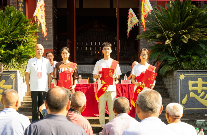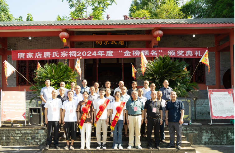 2024年8月24日,晨光熹微,九时整,广安市广安区花桥镇唐家店唐氏宗祠沐浴在温暖的阳光下,彩旗招展,鼓乐齐鸣,一场旨在表彰本年度家族中杰出大学新生的“金榜题名”颁奖典礼在此隆重举行。