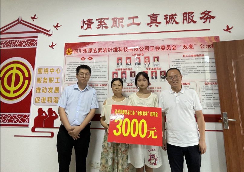 慰问组先后到四川炬原玄武岩纤维科技有限公司、斌郎街道斌郎社区困难职工家中,详细了解困难职工家庭情况和子女学习情况,为他们送上助学金。郭广恩希望受助学生把暂时的困难转化为前进的动力、人生历练的基石和成长的阶梯,珍惜时光,勤奋学习,用知识改变命运,常怀感恩之心,将来以实际行动报效祖国、奉献社会、回报父母。