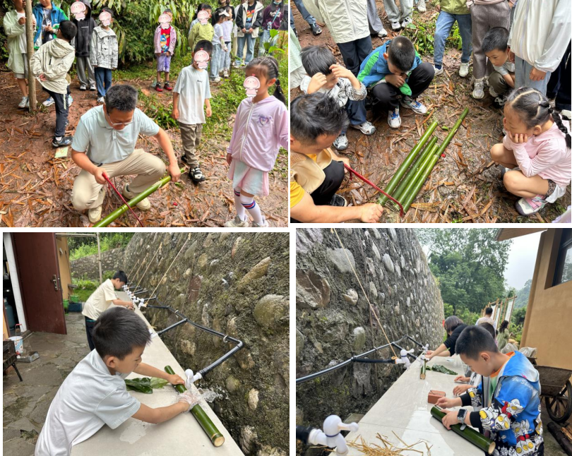 要想做出一顿美味的竹筒饭,前期准备工作至关重要,尤其是选取合适的竹筒。对于哪种竹子最适合制作竹筒饭,家长们最有发言权。在专业老师的带领下,家长和孩子们一同上山砍竹,精心挑选出最适合、最新鲜的竹子。砍好竹子后,大家将竹子洗净,接着,孩子们和家长齐心协力制作竹筒饭。他们小心翼翼地把提前准备好的糯米、红枣、腊肠等食材一勺一勺地灌进竹筒里,加入适量的水,再用竹叶把竹筒口封住,放入柴火灶中蒸制。