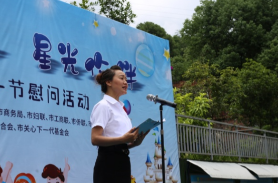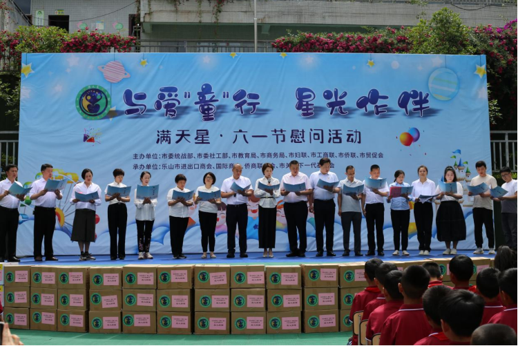在温馨的捐赠仪式上,商会胡英会长和商会关工委谢志强主任为孩子们送上真挚的节日祝福,希望他们沐浴阳光,茁壮成长。企业家们亮出“满天星”公益名片:聚是一团火,散是满天星,纵然市场风雨如晦,乐山企业家们依然不忘社会担当,点点星光汇聚,照亮孩子们前行的路。