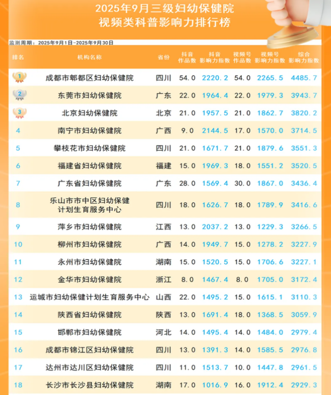 近日,国家卫生健康委妇幼健康中心发布2025年9月全国三级妇幼保健院官方抖音号和微信视频号科普作品影响力监测结果。在此次监测中,全国共330家三级妇幼保健院的285个抖音号和323个视频号参与评比,达川区妇幼保健院以优异表现荣获四川省第五名、全国第十七名的佳绩,实现了历史性突破