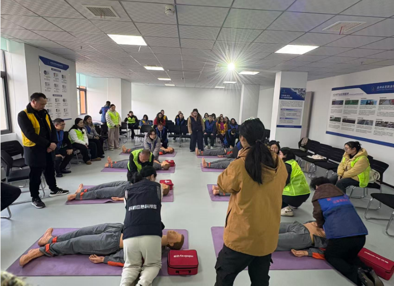 在实操演练环节,重点开展了安全绳使用、海姆立克急救法、AED操作与心肺复苏等关键技能训练。讲师逐步示范、细致指导,参训人员积极投入、反复练习,在“学练结合”中切实提升动手能力和应急反应水平。