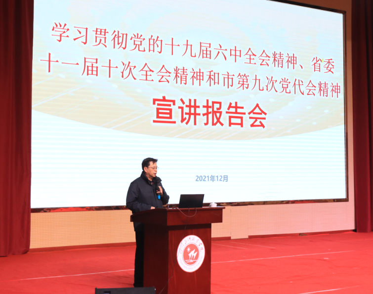 在泸州全市上下深入学习宣传贯彻党的十九届六中全会、省委十一届十次全会和市第九次党代会精神之际,12月16日下午,按照市委统一安排,市委宣讲团第十分团(高校学校宣讲分团)专家、四川三河职业学院副校长陈真教授,为我校干部、思政课教师、辅导员及部分学生代表近300人作宣讲报告。学校党委书记叶昌伦主持会议。