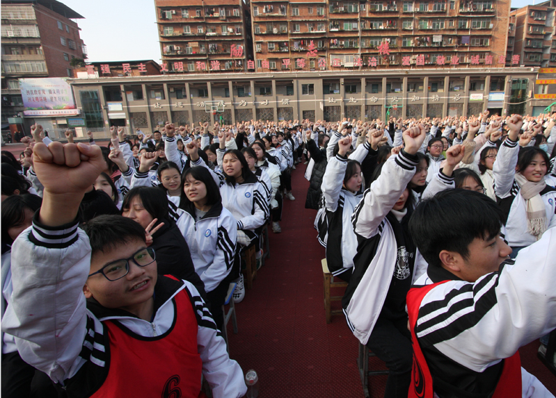 在一波波“哇”声惊呼之后,赵泽老师开始了幽默风趣的演讲,现场氛围轻松愉悦。在冥想目标理想环节,赵老师让同学们低头沉思一分钟,思考人生梦想,学习目标,并鼓励学生争相上台,将理想分享给大家,“我要上四川大学” “我要上厦门大学”“我要上重庆医科大学”“我要上西安交通大学”……在赵老师的引导下,同学们紧握拳头,当众大声喊出心中理想的大学,一遍又一遍呼喊,震耳欲聋,响彻校园,激发出学子们全力冲刺、高考必胜的澎湃激情,将现场气氛推向高潮。