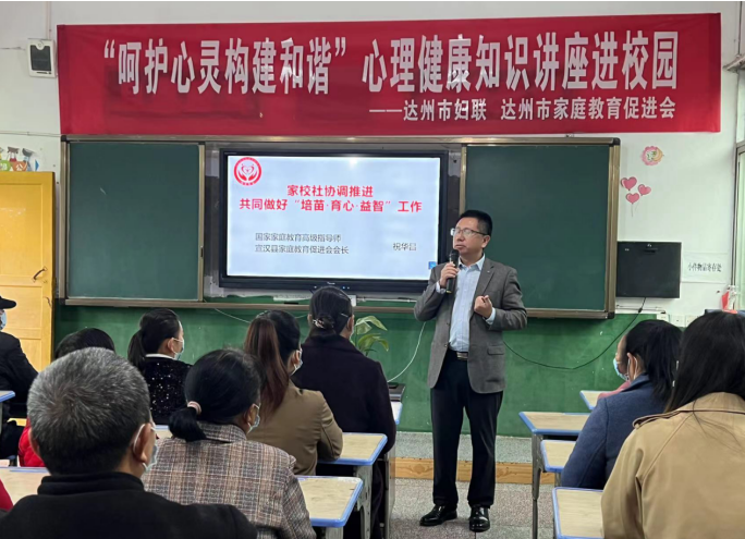 为深入贯彻习近平总书记关于注重家庭家教家风建设的重要论述,推动《家庭教育促进法》在我市落地落实,达州市妇联、达州市家庭教育促进会在全市实施家庭教育“五进”活动(进机关、企业、社区、学校、家庭)。2022年10月26日上午,国家家庭教育高级指导师,宣汉县家庭教育促进会会长祝华昌同志一行到宣汉县普光镇土主小学开展“呵护心灵构建和谐”心里健康知识及“幸福有方——家庭教育讲座”进校园活动。