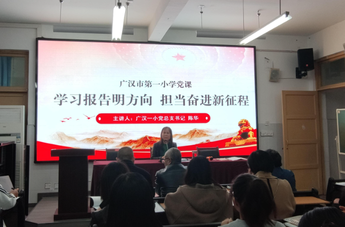 11月3日,广汉市第一小学党总支开展主题党日活动,党总支书记、校长陈华以《学习报告明方向,担当奋进新征程》为题,为全校党员干部、教职员工上思政课,教育大家要以“为党育人、为国育才”为己任,以“功成不必在我,功成必须有我”的责任感,赋能学生更多人生出彩出色的机会,办好人民满意的教育。