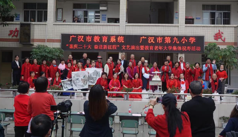 11月6日,由广汉市教育局、广汉市教育工会主办,以“喜庆二十大奋进新征程”为主题的文艺演出暨教育老年大学集体祝寿活动在广汉市第九小学隆重举行。教育老年大学学员、教职工之家部分社团、广汉九小师生代表、蜀中艺术团等400余人参加活动,广汉市教育局、教育工会、文化艺术馆、金佛社区、爱心企业相关领导及来宾到场祝贺观摩。教育工会副主席黄开福致辞祝贺,宣讲党的二十大精神,通报广汉市教育老年大学近年来办学成果,宣布广汉教育夕阳红艺术团成立。