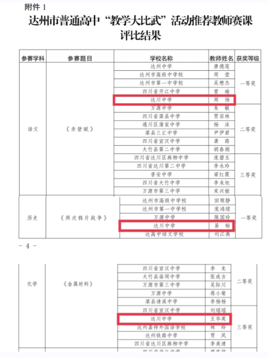 达州市普通高中教师教学“大比武”活动于12月1日—3日举行,其中达川中学周炀、易盼两位老师分别斩获一等奖,庞清文老师荣获二等奖,王华英老师荣获三等奖。另,参加抽选赛课的英语老师曾靖荣获优秀奖。
