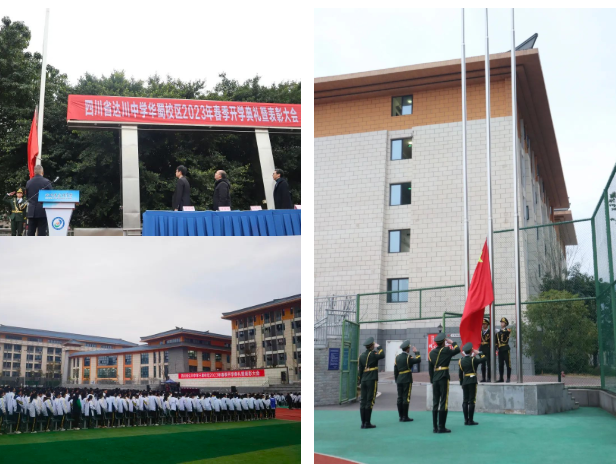 达川中学2023年春季开学典礼在庄重嘹亮的国歌声中拉开序幕,鲜艳的五星红旗在全校师生的注目下,伴随着雄壮的义勇军进行曲徐徐上升,高高飘扬在校园。