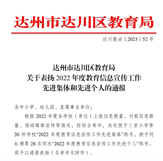 2月15日,达川区教育局对2022年度教育信息宣传工作先进集体和先进个人进行了表彰,达川中学获“教育信息宣传工作先进集体”称号,杨华老师荣获“达川区2022年度教育信息宣传先进个人”。