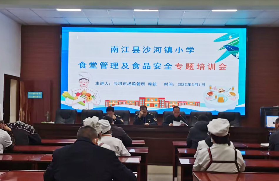 检查结束总结后,南江县沙河镇市场监管所所长席毅首先对学校食堂安全工作给予高度评价和肯定,对存在的问题也一针见血地指出并提出诚恳的建议。其次对食堂工作人员进行了《餐饮服务食品安全操作规范》培训,就卫生防控知识、食堂管理和操作流程、责任追究等方面分别做了详细讲解,要求从业人员要有“五心”:坚守岗位用真心,加工餐饮讲良心,操作环节要细心,服务学生有爱心,整治卫生下倾心,全面提高学校餐饮服务水平和膳食质量,同时强调做到食品安全隐患和春季流行性疾病隐患双防范。