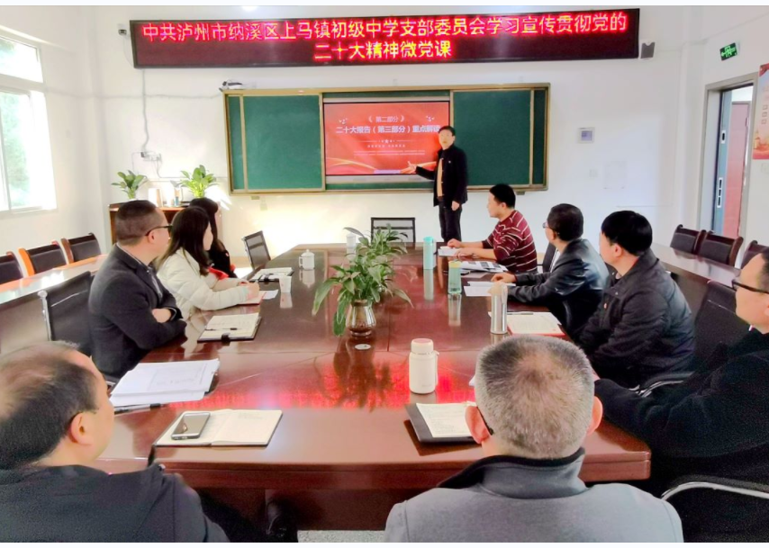 3月8日,泸州市纳溪区上马中学党支部持续学习宣传贯彻党的二十大精神的系列微党课,如期举行。由党支部组织委员牟文俊领学党的二十大报告第三部分:新时代新征程中国共产党的使命任务。
