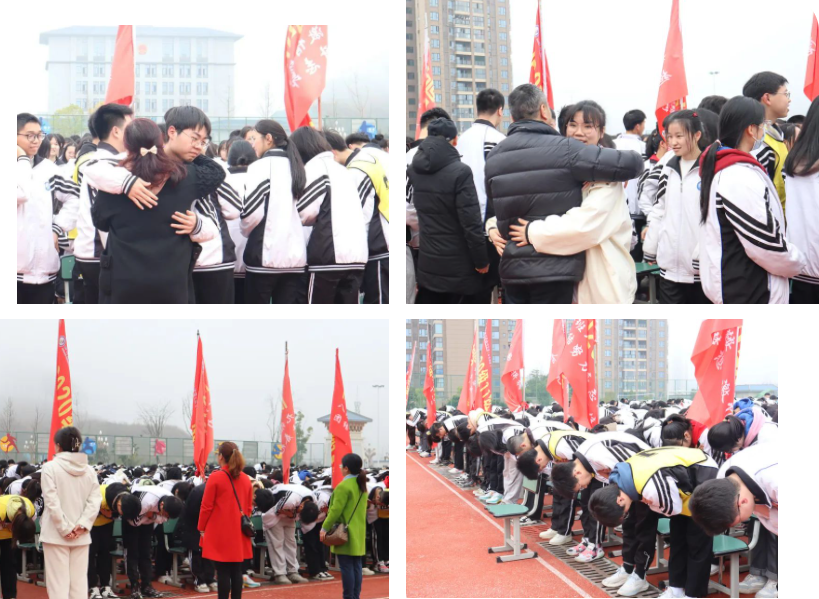 在感恩环节,全体高三学子向老师致感恩礼,一次次深深地鞠躬,一个个深情地拥抱,一句句师生间的真情告白,真挚而肺腑的话语,既拉近了师生的心灵距离,又极大地鼓舞了同学们的斗志。