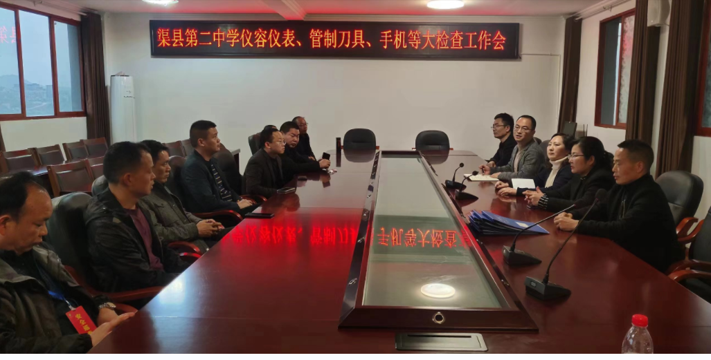 渠县第二中学政教处联合学校安办、保卫科召开了学生仪容仪表、管制刀具、手机管理等大检查工作会,学校党委副书记沈秀梅,党委委员、副校长黄景芸出席会议并讲话。政教处主任吴俊主持会议,安办、保卫科负责人和有关工作人员参加会议。