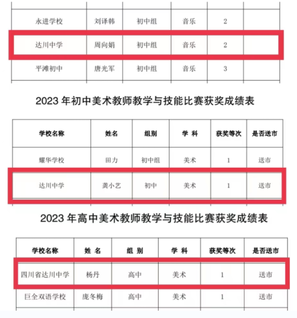 近日,达川区教育局公布了获奖情况。其中,达川中学体育学科初中组参赛老师郎佳凤获得一等奖,高中组参赛老师汪厚全、郭小沅老师分别获得一等奖;音乐学科初中组参赛老师周向娟获得二等奖;美术学科初中组参赛老师龚小艺获得一等奖,高中组参赛老师杨丹获得一等奖。