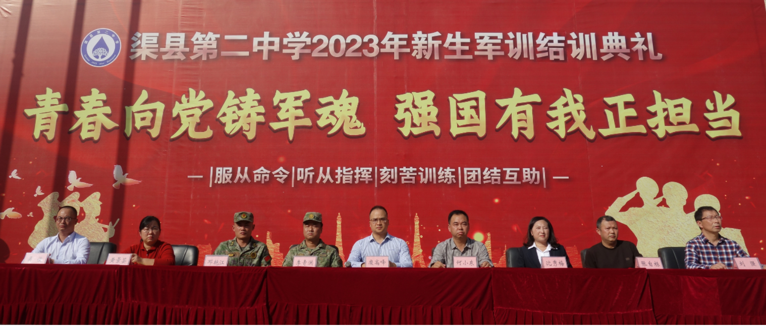 渠县人武部军事科科长李青洪、军训办主任邓艳江、军训总教官赵刚,渠县第二中学党委书记糜高峰,党委副书记、校长何小东,党委副书记沈秀梅,党委委员、副校长张自栋、黄景芸,高一年级主任刘强,政教处主任吴俊、副主任王永茂,全体军训教官、班主任和部分学生家长出席典礼活动。吴俊主持典礼仪式。
