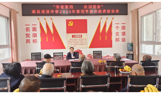 在2023重阳节之际,渠县清溪中学在支部活动室举行了一场别开生面的退休教师座谈会。该校退休教师、行政人员和部分年轻教师参加,学校党支部书记、校长王小平主持。