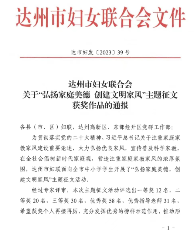 在老师的悉心指导和同学们的踊跃参与下,经过专家评审,达川中学共有七名同学获奖。其中,一等奖2名,二等奖2名,三等奖1名,优秀奖2名,郑泽申、黄龙君、徐亮亮、唐红四位老师荣获“优秀指导老师”称号。