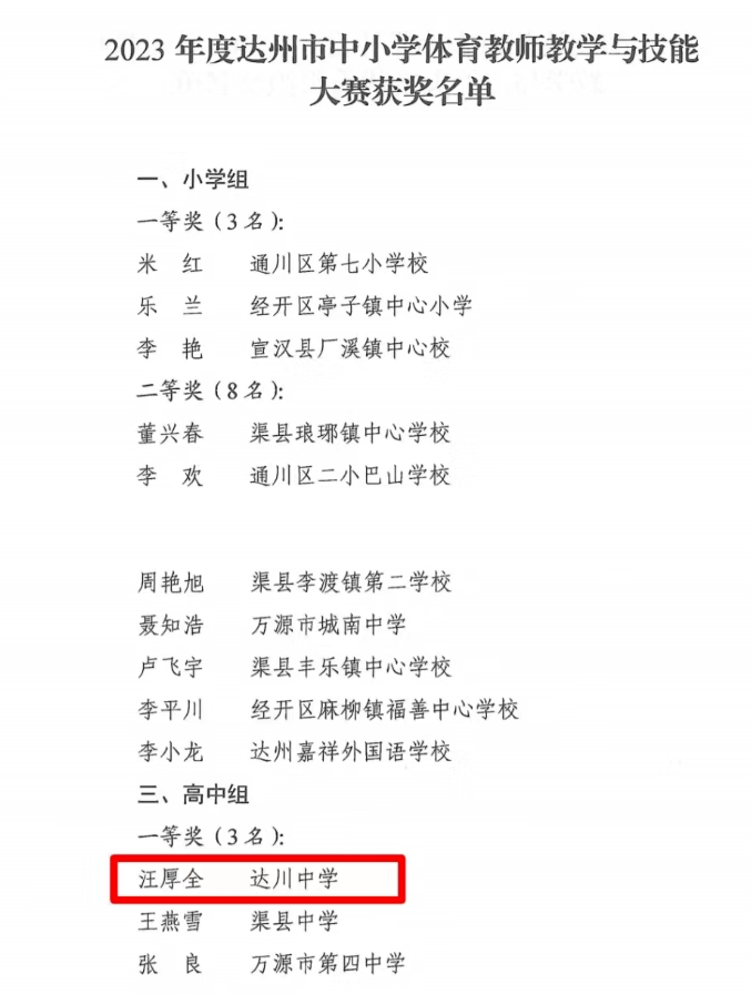 近日,达州市教育局公布了2023年度中小学体育、音乐、美术教师教学与技能大赛结果。四川省达川中学4名教师凭借过硬的基本功、稳定的发挥、出色的表现,喜获佳绩,2位老师荣获一等奖,1人荣获二等奖,1人荣获三等奖。