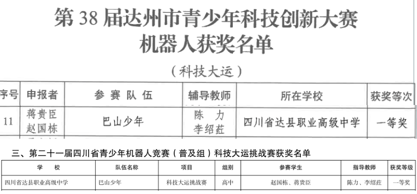 ——达县职高在省、市青少年机器人竞赛科技大运项目中喜获一等奖
