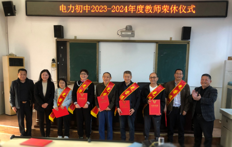 为营造尊师重教的良好氛围,增强教师的荣誉感、归属感和幸福感,4月8日下午,内江市电力初级中学校为2023-2024年度荣休的喻忠盛、蔡华群等七位同志举行了隆重而温馨的荣休仪式。