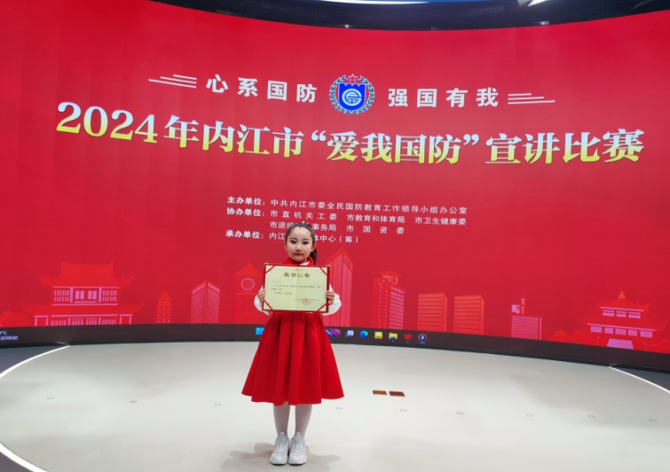 4月12日,为深入贯彻落实习近平总书记关于加强全民国防教育系列重要指示精神,认真落实党中央和省委、市委相关部署要求,由中共内江市委全民国防教育工作领导小组办公室主办的2024年内江市“爱我国防”宣讲比赛在内江日报隆重举行,内江市第一小学校学生黄艺昕代表市中区参赛,在志愿组的19名选手中通过激烈比拼、脱颖而出取得优异成绩。